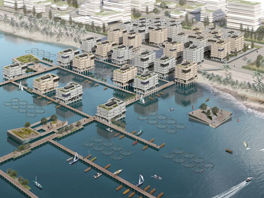 通過和大海建立良好的互動關(guān)系,市民們將享受到熱帶雨林公園,運(yùn)河,湖水和沙灘。區(qū)域規(guī)劃將主要致力于沿海社區(qū),使?jié)O業(yè)可以蓬勃發(fā)展。漁民們的住宅集合地附近將有空間方便船只??俊4送?,通過建造巨型海堤來幫助雅加達(dá)地區(qū)免受洪水的侵襲。