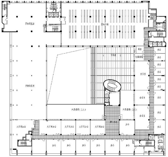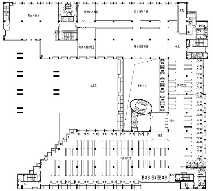 建筑整體圍繞著一個(gè)向西南開(kāi)放的內(nèi)院展開(kāi),內(nèi)院的邏輯源于對(duì)傳統(tǒng)四合院背后意義的新解釋?zhuān)鼛Ыo建筑能量:陽(yáng)光、空氣、景觀(guān),這便是方案所追求的新模式:集中式的便捷,分散式的環(huán)境優(yōu)雅,被融匯在一個(gè)理性的平面中,從而確保閱覽空間的采光通風(fēng)。