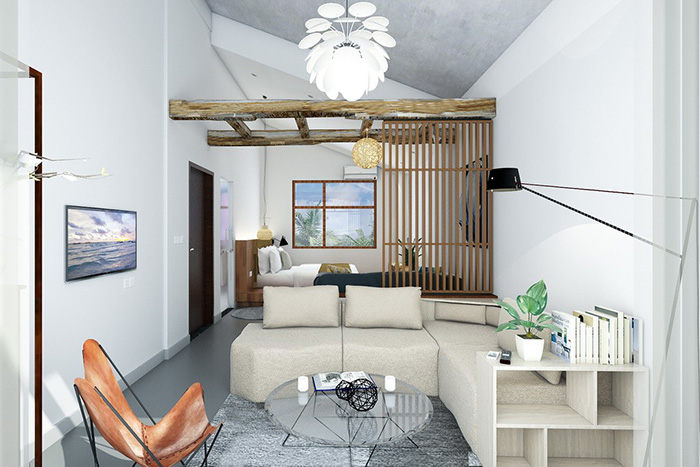 民宿南向墻面大面積打通,安置落地玻璃,設(shè)置陽(yáng)臺(tái),不僅保證了最大程度的光照還保證了住戶最大程度觀賞到南向的海景。