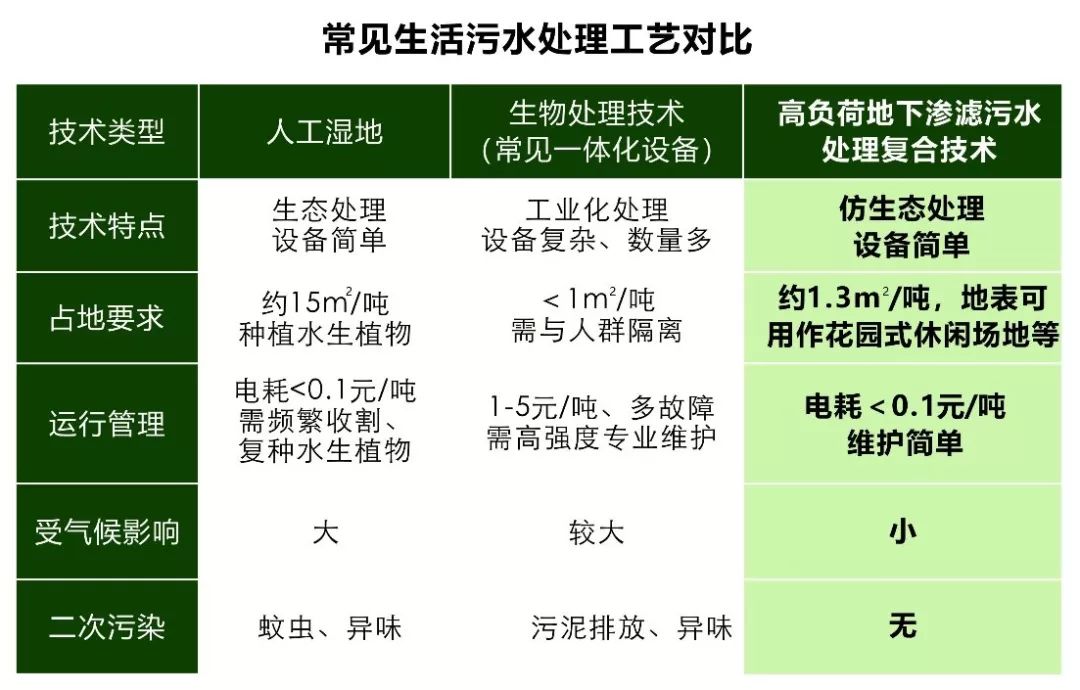 “高負(fù)荷地下滲濾技術(shù)”作為仿生態(tài)技術(shù),在保留了“傳統(tǒng)地下滲濾”傳統(tǒng)地下滲濾主要優(yōu)點(diǎn)的同時,克服了生化處理技術(shù)設(shè)備多、能耗高、需要專業(yè)維護(hù)等主要缺點(diǎn);同時又解決了生態(tài)處理技術(shù)占地面積大,冬季無法正常運(yùn)行的重大缺陷。