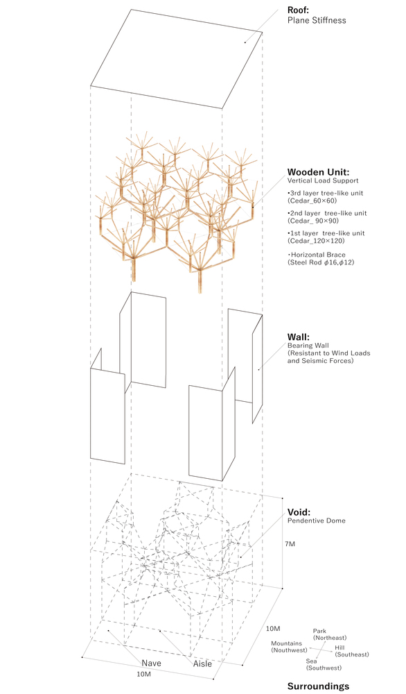 四角的承墻墻體承擔水平力,內(nèi)部木單元支撐屋頂負荷,可達25噸。