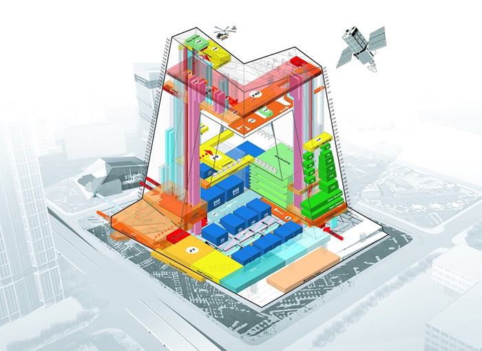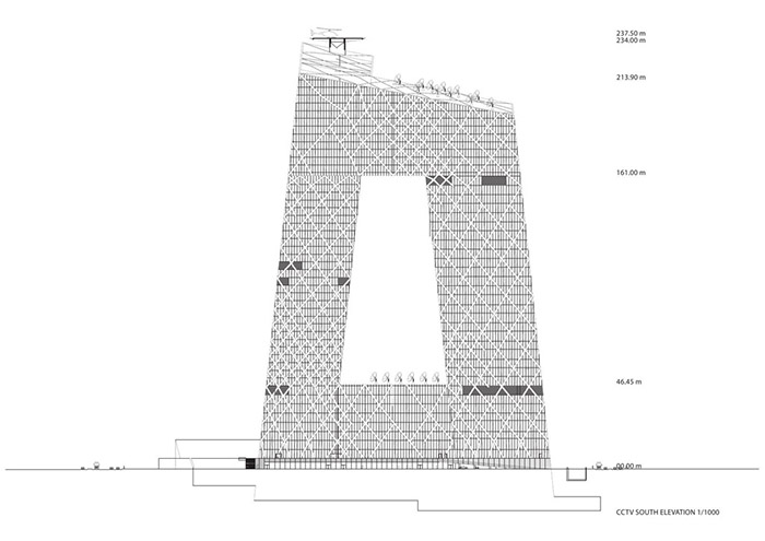 CCTV大樓的形式有助于將電視制作的整個工作流程組合在一個緊密相連的環(huán)路中。兩座塔樓從一個容納演了制作播室的共同基座上升起,并有所分工﹕塔樓壹是編輯和辦公區(qū),而較低的塔樓貳則主要服務于新聞制播。兩座塔樓由通過容納行政管理區(qū)的空中之橋——懸臂連接在一起。