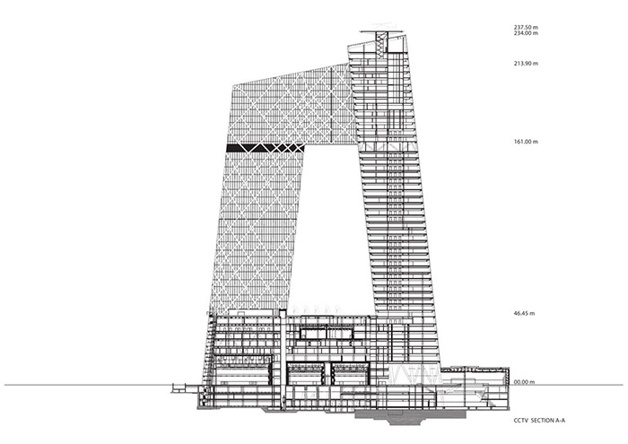 大樓創(chuàng)新的結構是由歐洲與中國的建筑師以及結構工程師長時間合作的成果,為高層大樓設計提供了新的可能性。CCTV 新址大樓的結構受力在幕墻上表現(xiàn):網(wǎng)狀的斜交鋼構件-斜交格構-呈不規(guī)則的菱形圖案在受力較大的區(qū)域構件比較密集,而需要較小支撐的區(qū)域相對疏朗。因而幕墻成為大樓結構的視覺表達載體。