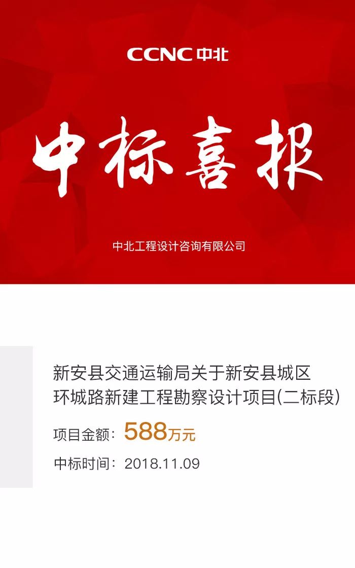 恭喜中北工程設(shè)計(jì)咨詢有限公司(簡稱中北設(shè)計(jì)院)憑借豐富的勘察設(shè)計(jì)經(jīng)驗(yàn)、強(qiáng)大的技術(shù)團(tuán)隊(duì)、拔萃的行業(yè)競爭力以及良好的信譽(yù)度于2018年11月9日順利中標(biāo)“新安縣交通運(yùn)輸局關(guān)于新安縣城區(qū)環(huán)城路新建工程勘察設(shè)計(jì)項(xiàng)目(二標(biāo)段)”。